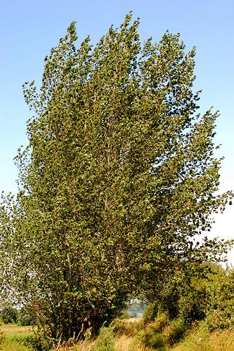 Árbol que puede alcanzar los 30 m. de altura, de corteza lisa y grisácea en los ejemplares jóvenes, con grietas longitudinales. Difiere de álamo o chopo blanco por sus hojas de contorno romboidal a ovado-triangular, con el envés glabro, siendo ambos lados de la hoja del mismo color prácticamente.