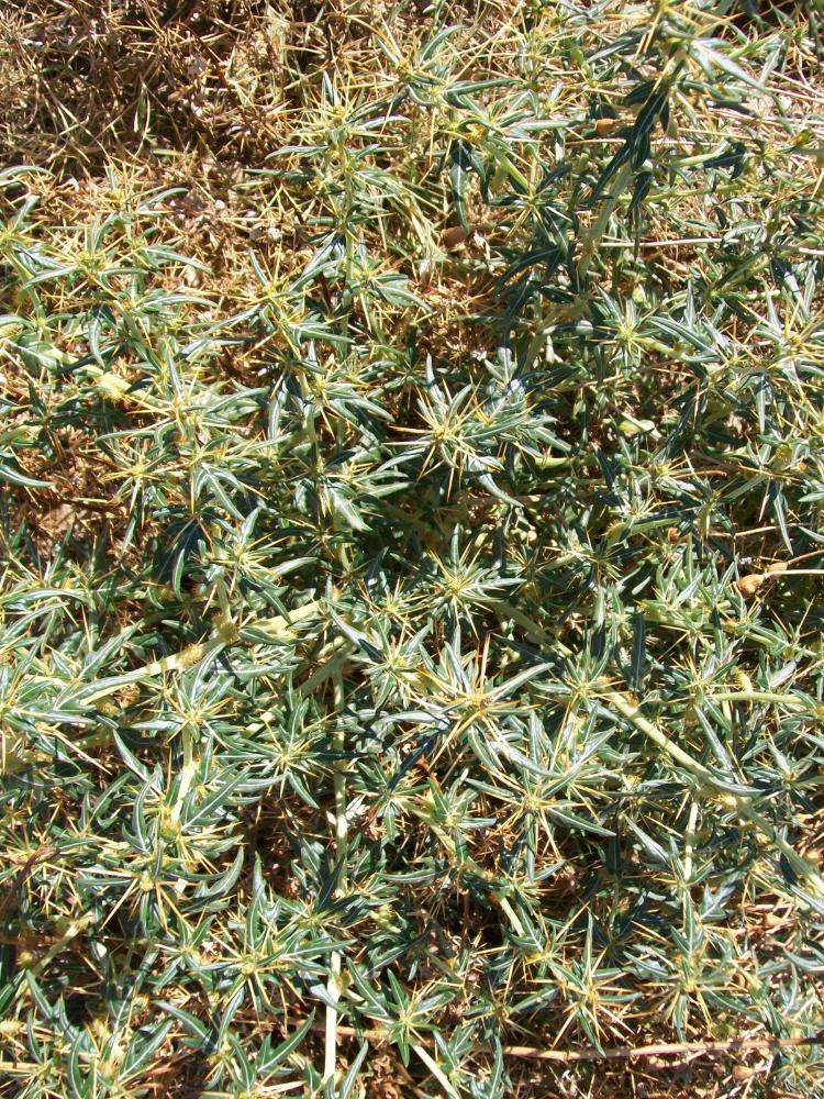 Planta herbácea anual de unos 30 cm. de altura. Posee hojas lanceoladas lobuladas de color ver de oscuro con envés grisáceo o blanquecino. Inconfundible con sus congéneres, por presentar 1-2 espinas amarillentas en la base de las hojas.