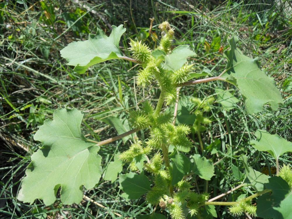 Planta herbácea de unos 30-60 cm., de hojas grandes más o menos triangulares y ásperas. Sus frutos espinosos están cubiertos de aguijones curvados en el ápice, ayudando a la diseminación de sus semillas al quedarse agarrados al pelo de los animales.