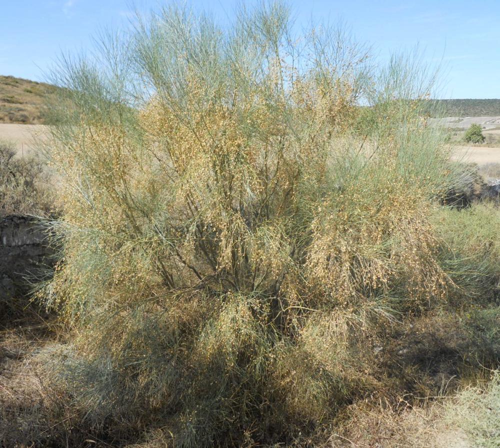 Es un arbusto que puede alcanzar 3 m. de altura generalmente desprovisto de hojas, grisáceo y muy ramificado. Las flores son papaleonáceas amarillas, muy pequeñas de 5-8 mm de longitud, agrupadas en racimos. Destacan sus frutos ovoideos, indehiscentes y que persisten en la planta después de la madurez.